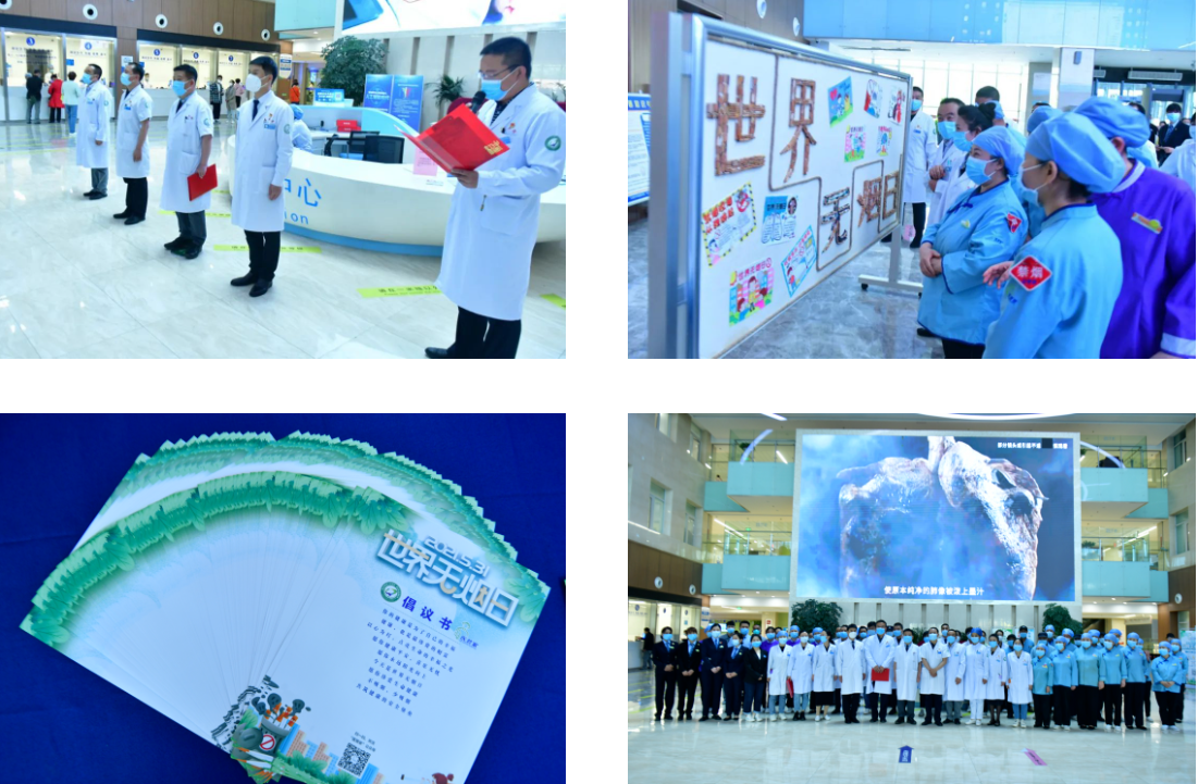 5月31日“世界无烟日”当天,我院后勤服务中心组织人员,通过大屏幕播放控烟宣传短片、悬挂宣传横幅、张贴海报、摆放宣传展板、发放宣传手册等形式,向院内医务人员、患者、家属等宣教烟草的危害及控烟的必要性,让医务人员带头起到控烟“先行军”的示范作用,调动医务人员争做控烟的传播者和践行者,以身作则不吸烟,以此带动身边人远离烟草。