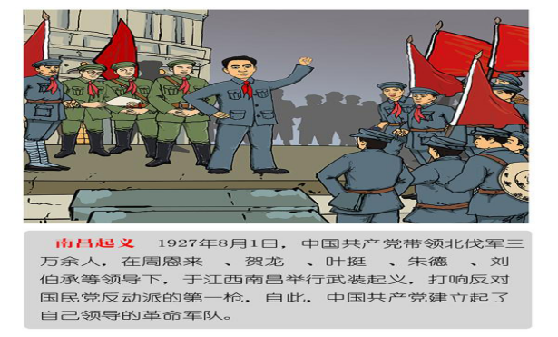 1927年8月1日,在以周恩来为书记的中共前敌委员会的领导下,贺龙、叶挺、朱德、刘伯承等人率领党所掌握和影响下的军队两万多人,在南昌城头打响了武装反抗国民党反动派的第一枪。经过4个多小时激烈战斗,起义军占领了南昌城。