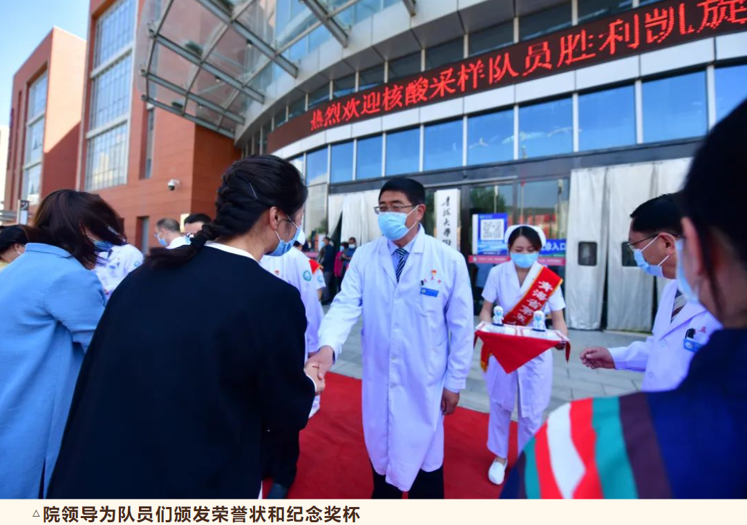 抗疫尽显英雄志,盛夏六月奏凯歌。6月13日,我院分批次派往主城区、湟中区的287名核酸采样队员、1名派驻新冠肺炎定点救治医院院感专家,1名承担转运任务的负压救护车司机,圆满完成任务,平安凯旋,为表达崇高的敬意,我院在门诊楼前举行核酸采样队员欢迎仪式,全院干部职工怀着无比激动的心情迎接“抗疫英雄”回家。