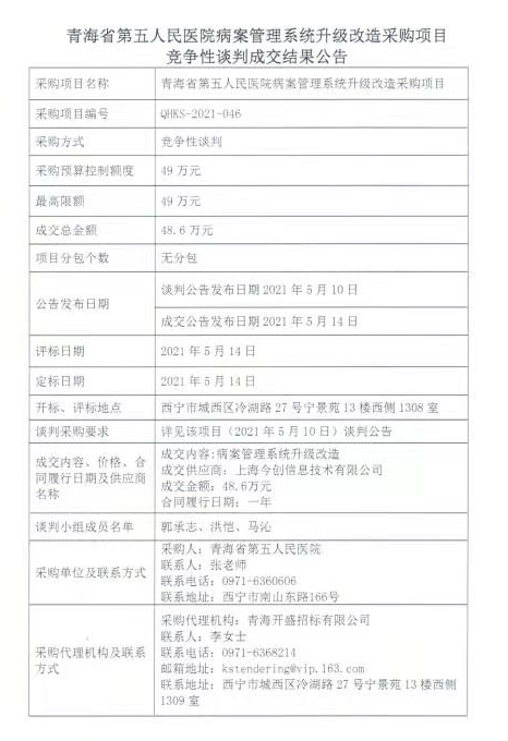 » 青海省第五人民医院病案管理系统升级改造采购项目成交结果公告