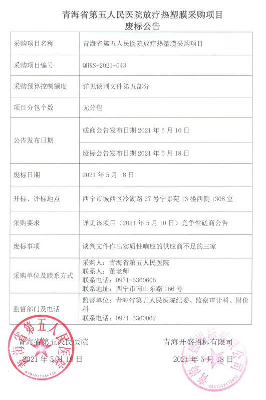 青海省第五人民医院放疗热塑膜采购项目废标公告